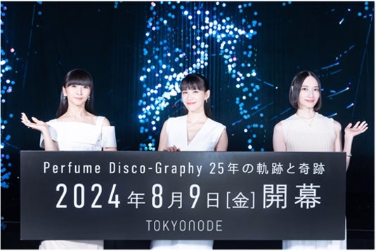 8月8日にPerfumeのライブステージの数々を“Perfume視点で”体験するエキシビション「Perfume Disco-Graphy 25年の軌跡と奇跡」開幕直前&Perfume周年企画記者発表会が行われ、Perfumeが出席しました。