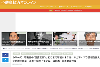 「シリーズ;不動産の”正直営業”はどこまで可能か??④ ネガティブな情報を伝えて感謝された 正直不動産「モデル」の鈴木・誠不動産社長」という記事が、不動産経済オンラインに掲載されています。