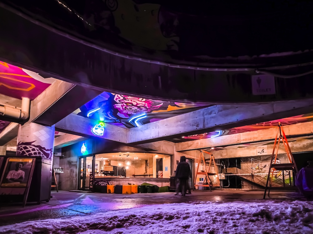 白馬五竜スキー場としての初のアート企画で、55周年を迎える白馬五竜が「自然とアートの融合」をテーマに実施した特別プロジェクトです。会場は、冬季限定で営業するLift Up Coffee前のコンクリートスペース。これまで薄暗く殺風景だった場所を、アーティスト澁谷忠臣氏のグラフィックアートとはらわたちゅん子氏のネオンアートが彩り、スキー場の新しい風景をつくり出しています。