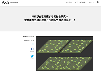 科学(pick up science)「MITが自己修復する素材を研究中 空気中の二酸化炭素と反応して自ら強固に!?」という、MITの化学エンジニアによる自己修復材料の研究について取り上げている記事が、Web Magazine AXISに掲載されています。