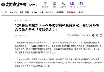 科学(pick up science)「北大特任教授がノーベル化学賞の受賞決定、喜び分かち合う教え子ら「実は気さく」」という記事が、読売新聞オンラインに掲載されています。