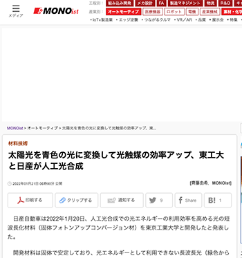 科学(pick up science)「太陽光を青色の光に変換して光触媒の効率アップ、東工大と日産が人工光合成」という東工大と日産による開発について取り上げている記事が、MONOistに掲載されています。