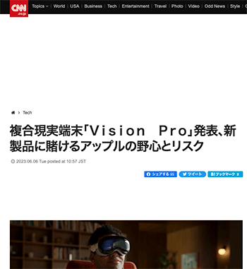 「複合現実端末「Vision Pro」発表、新製品に賭けるアップルの野心とリスク」という「Apple Vision Pro」について取り上げている記事が、CNN.co.jpに掲載されています。