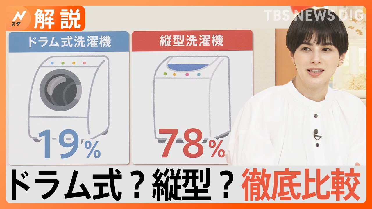 洗濯機はドラム式?縦型? 洗い方や乾燥機能の違いを比較! 人気上昇中の縦型、買い時は“今”!/動画(youtube/TBS NEWS DIG Powered by JNN)