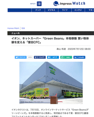 「イオン、ネットスーパー「Green Beans」本格稼働 買い物体験を変える「誉田CFC」」というイオンの取り組みについて取り上げているという記事が、Impress Watchに掲載されています