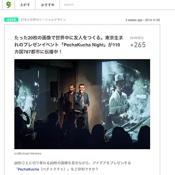 →『たった20枚の画像で世界中に友人をつくる。東京生まれのプレゼンイベント「PechaKucha Night」が110カ国787都市に伝播中!』