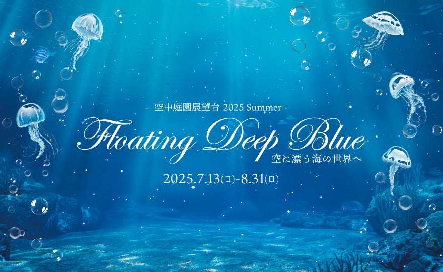 梅田スカイビルの空中庭園展望台が、7月13日〜8月31日の期間限定で“深海の世界”に変貌。「Floating Deep Blue」と題し、クラゲや泡の演出、幻想的な照明、丸窓フォトスポットなどが登場。地上173mから眺める夜景と融合し、昼夜で異なる“空に漂う海”を体感できる。