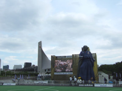 入口のテントをぬけると、フットサルコートの向こうに大きなスクリーンとともに坂本龍馬さんの巨大な像が見えていましたよ。