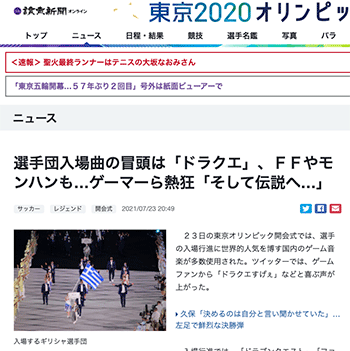 「選手団入場曲の冒頭は「ドラクエ」、FFやモンハンも…ゲーマーら熱狂「そして伝説へ…」」という東京オリンピック開会式関連のニュースを取り上げている記事が、読売新聞オンラインに掲載されています。→『選手団入場曲の冒頭は「ドラクエ」、FFやモン...